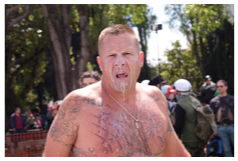 It goes on like this for nearly two hours. The riot police are conspicuously absent. The left-wing side makes attempts to break through right-wing lines and enter the park. The groups face off, brawl, and retreat over and over again. When the leftists get close to the stage, the leader of the Three Percenters orders his men to rally up and take defensive positions. The man in the Spartan mask yells out a battle cry, lunging into the left-wing side, and someone pepper sprays him. He takes his shirt off, squirts milk into his eyes from a spray bottle, and continues fighting.