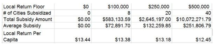 The carve-outs required to fund the local return floor vary in size depending on how many cities receive the subsidy, and the size of the subsidy. As the floor rises, the per capita amount available for the unsubsidized cities falls.