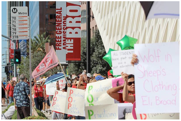 The audacity of these billionaires boggles the mind. They have appointed a hardball charter school lobbyist to run their new 501c3 non-profit, rapidly tossed together after a major teacher and public protest at the Broad Gallery on the day of its opening. Broad's paid articles and editorials have been run in the LA Times, suggesting that their hired gun (hired to kill public schools in favor of free market profiteering) should give the new Superintendent of Schools “a seat at their table" and thus be able to participate in this destruction of public education. It is the greatest form of sophistry we have witnessed yet. It is off the charts in terms of any democratic structure...and public education has always been the crux of our democracy.