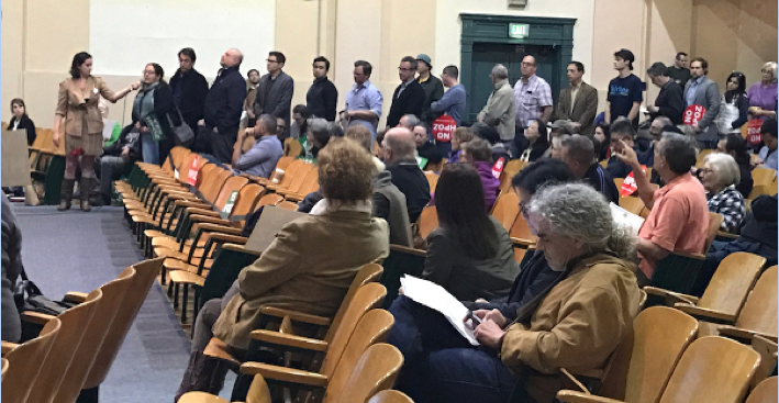 About 150 people attended the meeting, held at John Burroughs Middle School, and it was obvious from the beginning that the organizers were expecting what might politely be referred to as a “lively” discussion: the meeting opened with a welcome and coaching on rules of decorous behavior by Kiara Nagel, a consultant hired by CD4, who specializes in “services to foster collaboration, grow healthy organizations, and support equitable community development,” according to her