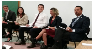 (Photo left: Candidates from left to right are Doug Haines, Sylvie Shain, moderator, Jessica Salans, and David De La Torre)