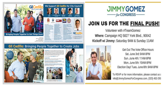 Also like Cedillo, Gomez accused his opponent of being a closet Republican. Like Cedillo, he exploited the name and image of someone who was neither running nor endorsing in the race. In Gomez' case, it was Martin Luther King, Jr. He also sent out a flyer during the runoff campaign that quoted Maria Cabildo, one of his primary opponents, saying "we all" support Jimmy Gomez. That is not exactly accurate, since Gomez listed endorsements from only 9 of his 22 primary opponents. Gomez also quoted former President Obama as "thanking" him for leadership on the environment, without listing an actual endorsement.