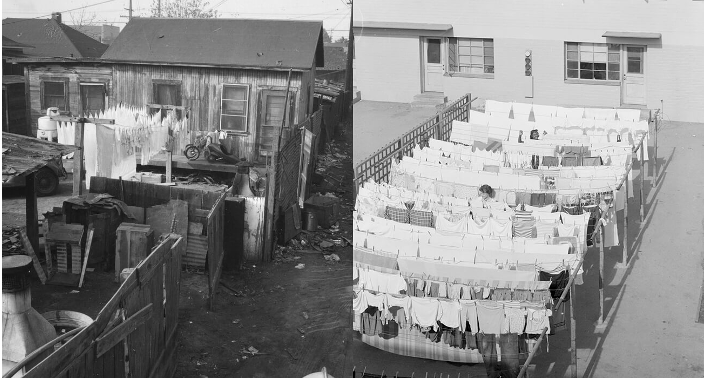Left: 2319 1/2 Damon Street (Santa Fe), 1950, Leonard Nadel. Leonard Nadel miscellaneous papers, 1948–1990. Getty Research Institute, 2002.M.42. Right: Outdoor laundry lines, ca. 1948–1949, Leonard Nadel. Leonard Nadel Photographs of Aliso Village. Getty Research Institute, 2002.M.42