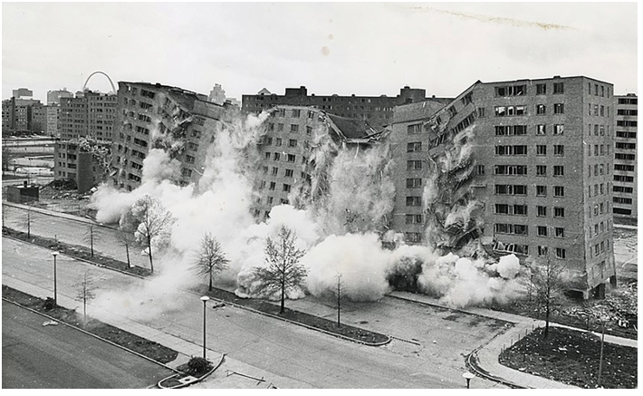 The second, widely televised demolition of a Pruitt–Igoe building in April, 1972. Source: U.S. Department of Housing and Urban Development. Image courtesy Wikimedia
