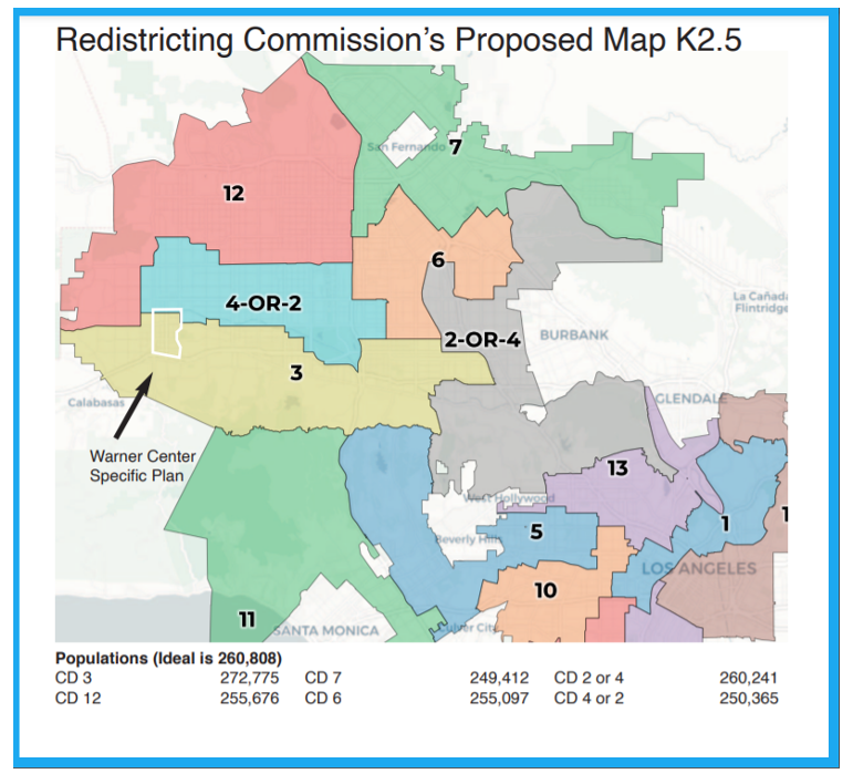 Members of the Woodland Hills Warner Center Neighborhood Council (WHWCNC) have considered the two previous maps that the LACCRC had considered – map K 2.5 and map L. For some reason, map L has been taken off the table, and currently, the LA City Redistricting Commission is only considering what is now called K 2.5 – 1.