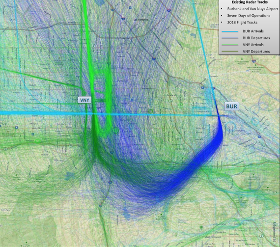 The map above shows the flight paths that the planes take from both the Hollywood Burbank and the Van Nuys airports.