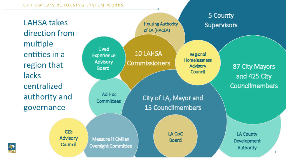 In LA County, of course, we have the 5 member Board of Supervisors, their CEO, the LA Count;y Homeless Initiative, and their Measure H Citizen Oversight Committee.