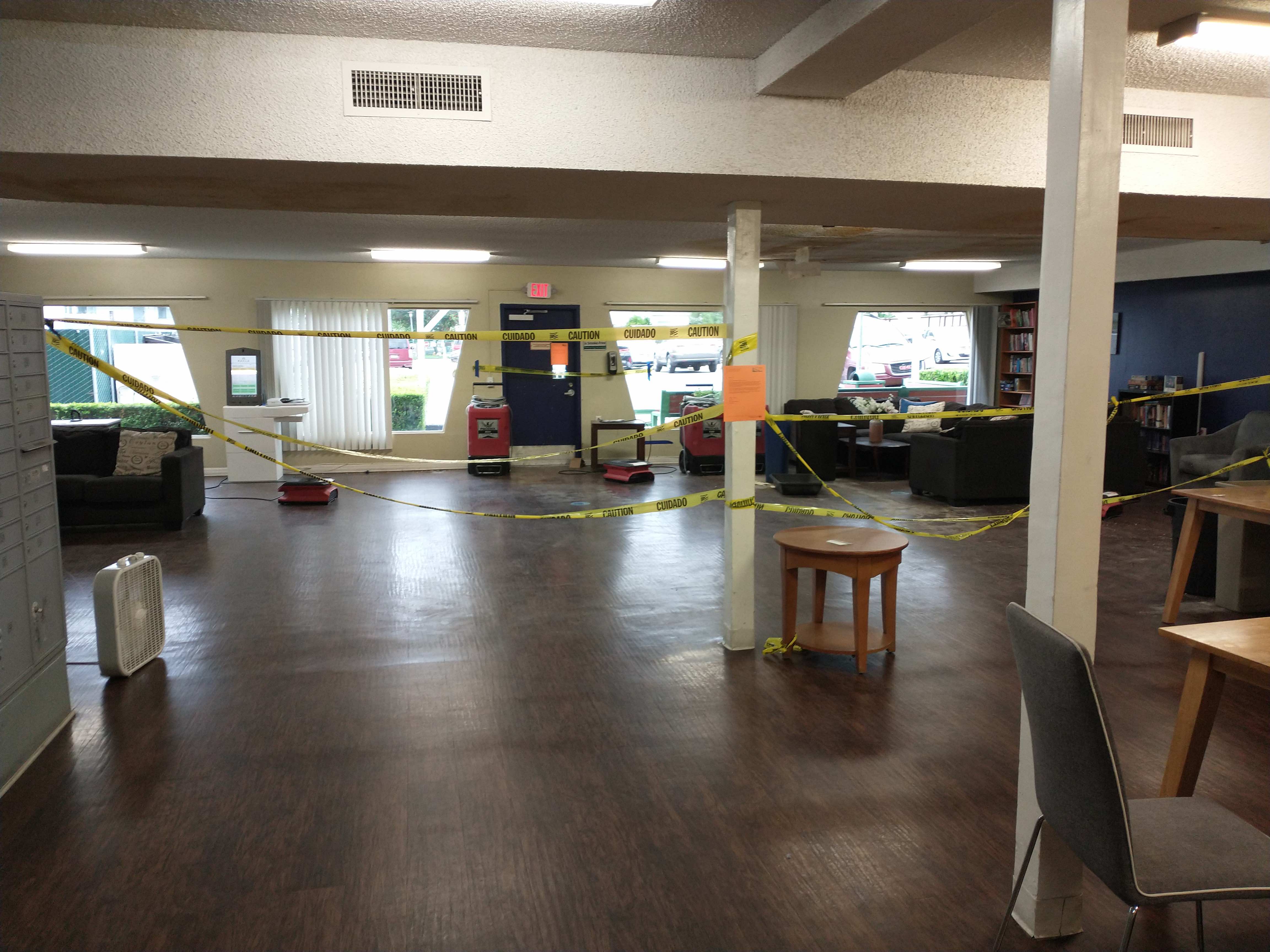 In one of those “a picture tells it all”, you can see from the photo above that most of the Community Room of the facility is taped off, due to water damage which has not been addressed at all.
