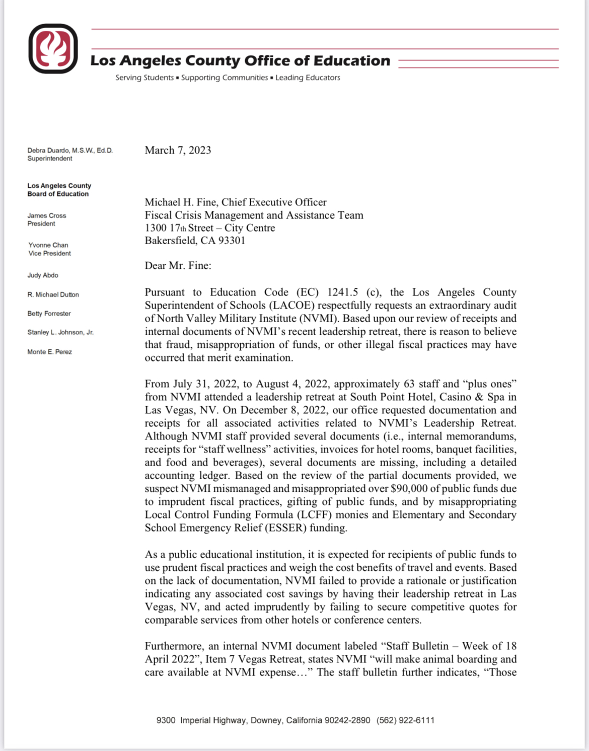This move by NVMI comes amid an extraordinary audit of its finances by the Fiscal Crisis Management and Assistance Team (FMCAT) urged by the L A. County Office of Education (LACOE). In its March 7 letter, LACOE documents "illegal activities" by NVMI. Among other misdeeds, LACOE alleges NVMI "mismanaged and misappropriated" $90,000 of public money for a 4-day junket in Las Vegas in Aug. 2022 by up to 63 NVMI staff and family members. The NVMI superintendent admitted in writing in Dec. 2022 that NVMI used federal dollars for the trip. That is a forbidden use of the federal money.”