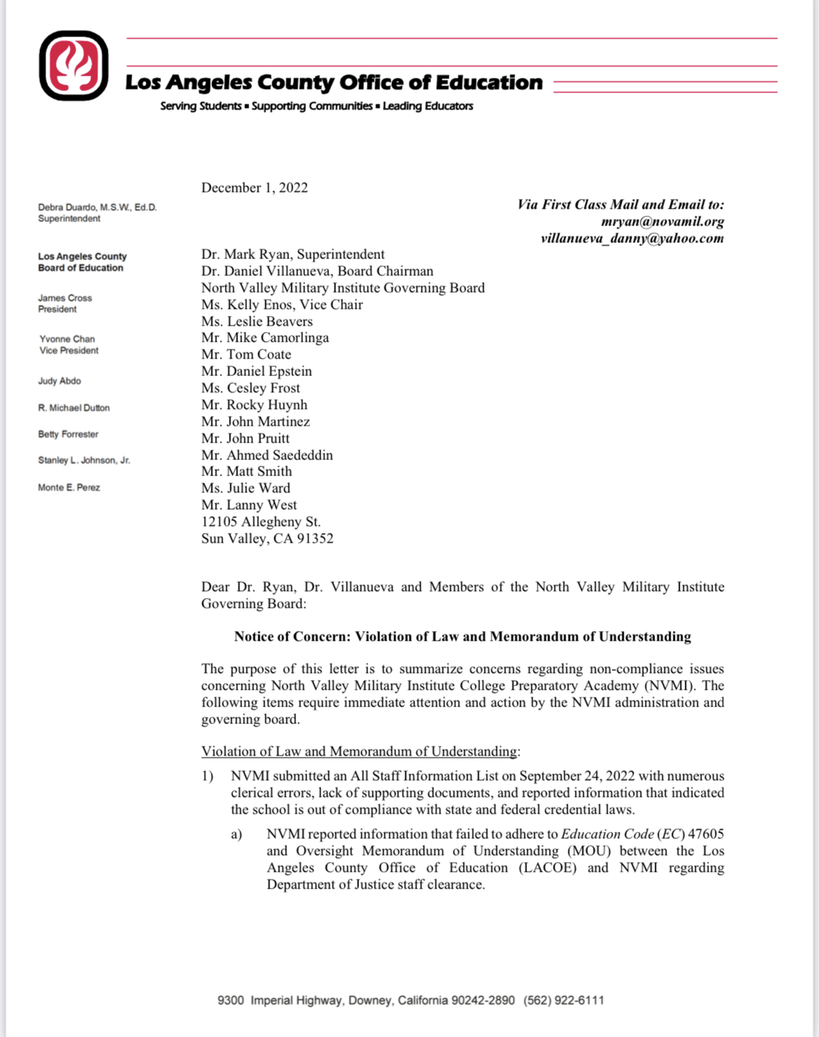 ... “NVMI ceased to operate in full compliance with its LACOE charter long ago. It is a poster child for fraud, waste, and exploitation of lobbying and political influence strategies by a charter school just to stay alive. We ask you to do your part to end this disastrous shell game. We count on you to protect public dollars and taxpayers and to stop the ruinous enabling of this rogue organization.”