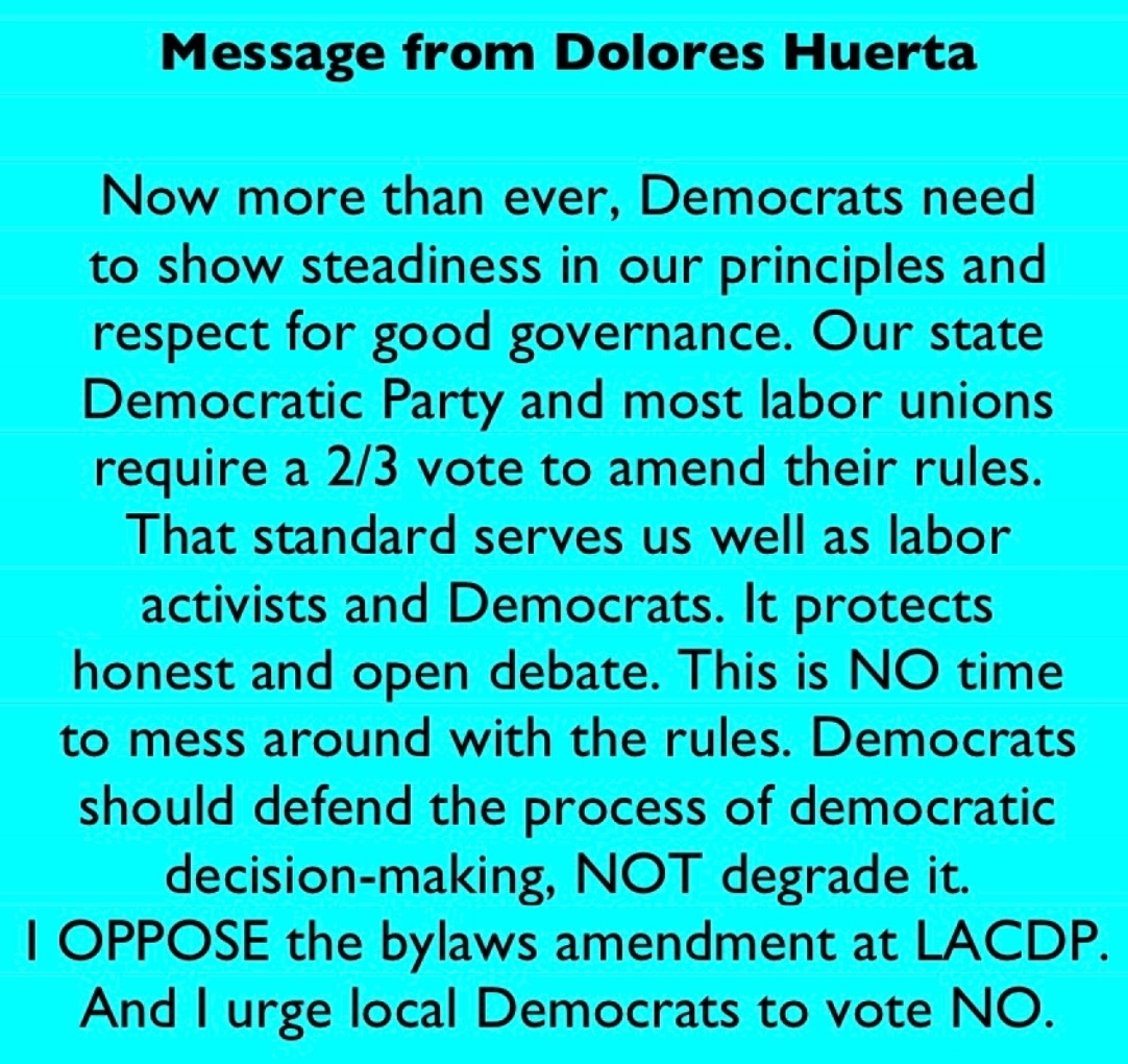 In her statement to local Democrats, Huerta pointed out that the 2/3 vote requirement of membership to change the bylaws was written into the state Democratic Party bylaws and into the constitutions of most labor unions.