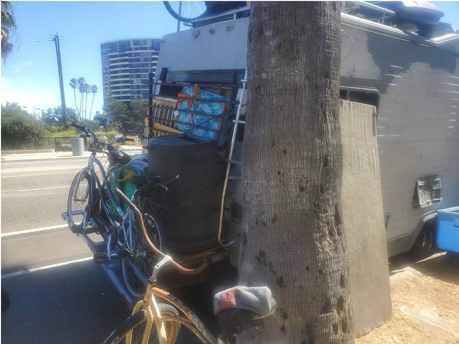 For this "new neighbor" has taken her space to a new level as bicycles and other personal items are across the sidewalk as well as the parking on the street as another oversized vehicle makes its way back to Washington Boulevard at the Venice & Maria border.