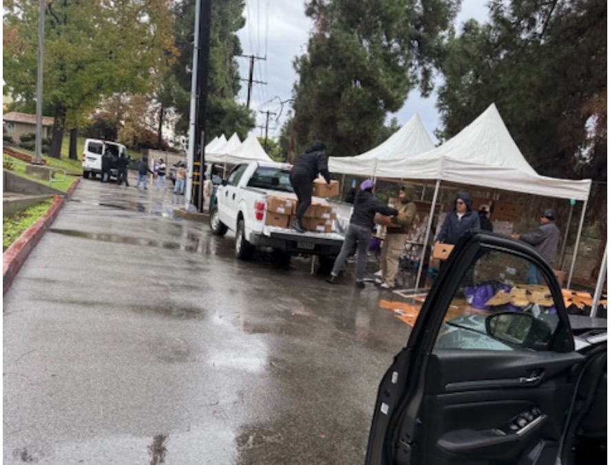 The distribution took place in the rear parking lot of the Highland Park Senior Center. More than a dozen canopies and tables were set up during Friday’s early morning hours by CD 14 staff members all taking place during the rain. Each table listed the names of various organizations including Church groups, schools, Highland Park Recreational Center, Art Snyder Retirement Home and various non-profits that represented Eagle Rock, Highland Park and El Sereno. Also, more than a hundred turkeys were handed out to Seniors at the Highland Park Senior facility.