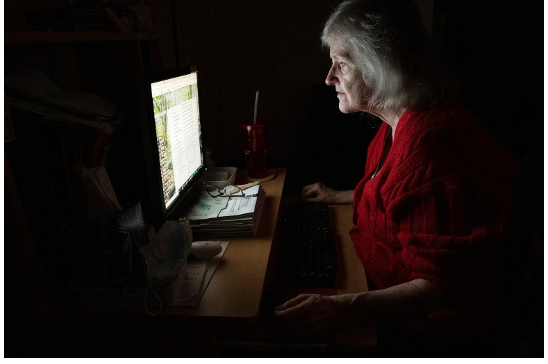 Nance Parry spends hours each day at home gazing in her computer while searching and applying for jobs at her home in Duarte. Dec. 6, 2021. Photo by Raquel Natalicchio for CalMatters