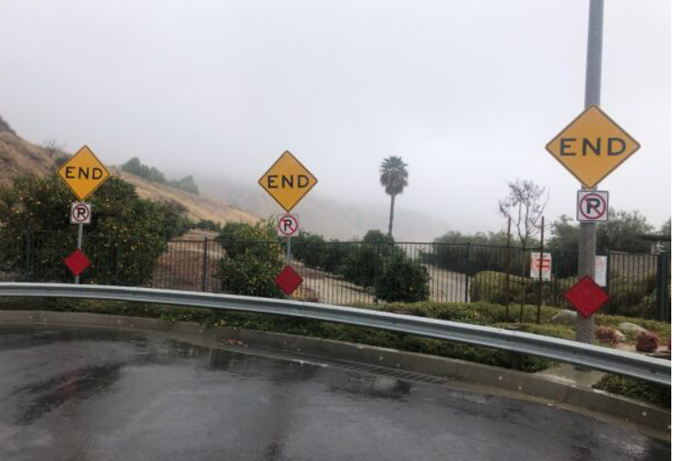 Baseline dead-ends at an orange grove, which provides a bit of agricultural respite, and beauty, between the development and a dry hillside crisscrossed with hiking trails. Many of the oranges lay unpicked, rotting on the ground.