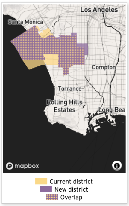 A special election in the old AD62 has already started for her short-lived replacement, to be followed by selection of her permanent AD61 successor in CA’s primary elections on June 7, 2022. Calmatters has a terrific tool to find your new districts (not just Assembly, but Senate and Congressional) here. This map from them shows the overlap of old (yellow) and new (purple):