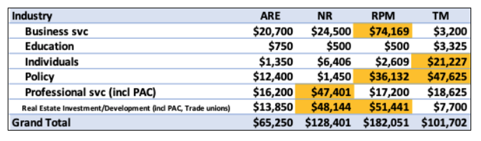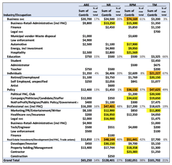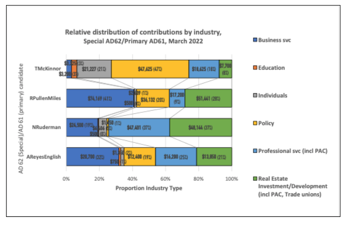 Ruderman shares constituency of the business sector with Pullen-Miles. Approaching half of Pullen-Miles’ money comes from the business world, including hotels and hospitality, as well as general and automotive retail there (table 2). Ruderman’s and also Reyes English’s contributions are likewise business oriented. Hers includes some law enforcement money and both reflect professional service in PR, Marketing and writing. Ruderman’s own professional background mirrors considerable support from professional service providers like lawyers, healthcare and insurance providers.