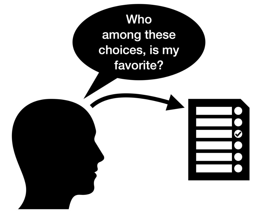 In ordinary voting, the question of “who” is asked: “who is your favorite”? Failing to reach a threshold, regardless of whether 50% or 60%, triggers a second election at a later time, among the top-two vote getters (or in the case of club endorsements via an idiosyncratic method specific to the club).