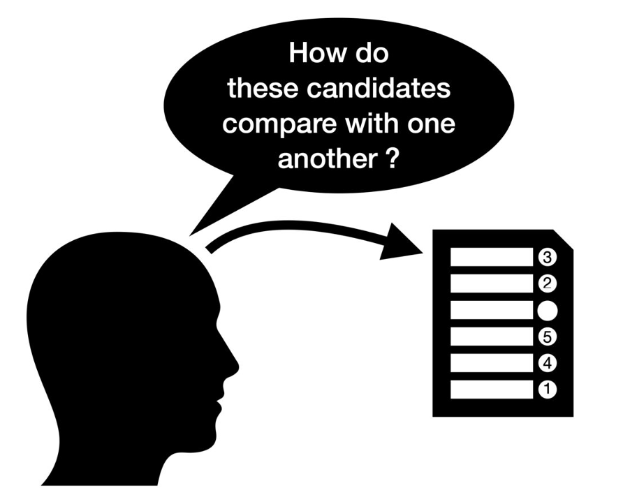 In RCV, the question of “how” is asked: “how do the candidates compare”? Failing to cross the threshold triggers further consideration of the order in which voters ranked candidates.