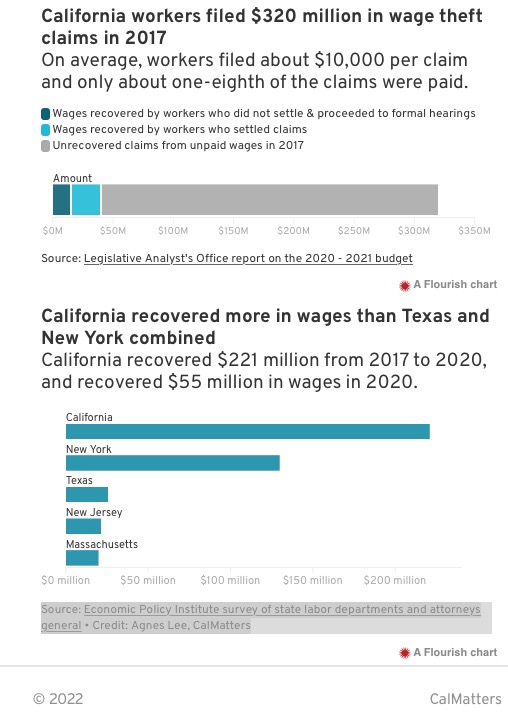 Either way, that’s down from prior years, when on average 30,000 workers annually claimed $320 million in unpaid wages, the office told the Legislative Analyst’s Office in 2020. Workers recovered about $40 million, or one-eighth, of those claims, the LAO said.