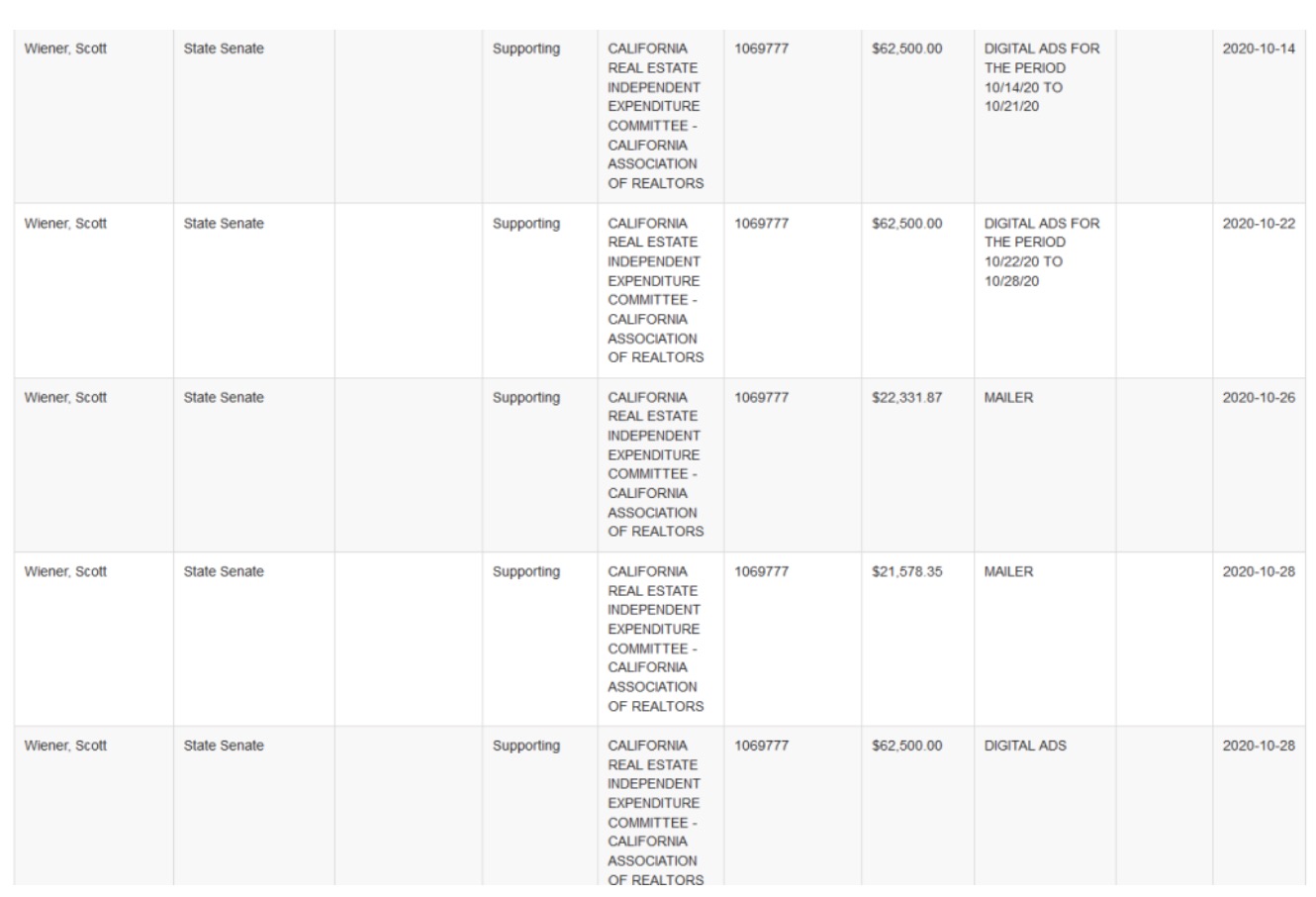 Screen shot of some of the special interest PAC expenditures in support of state senator Scott Wiener that are, of course, completely unrelated to his push to allow development in fire danger zones.