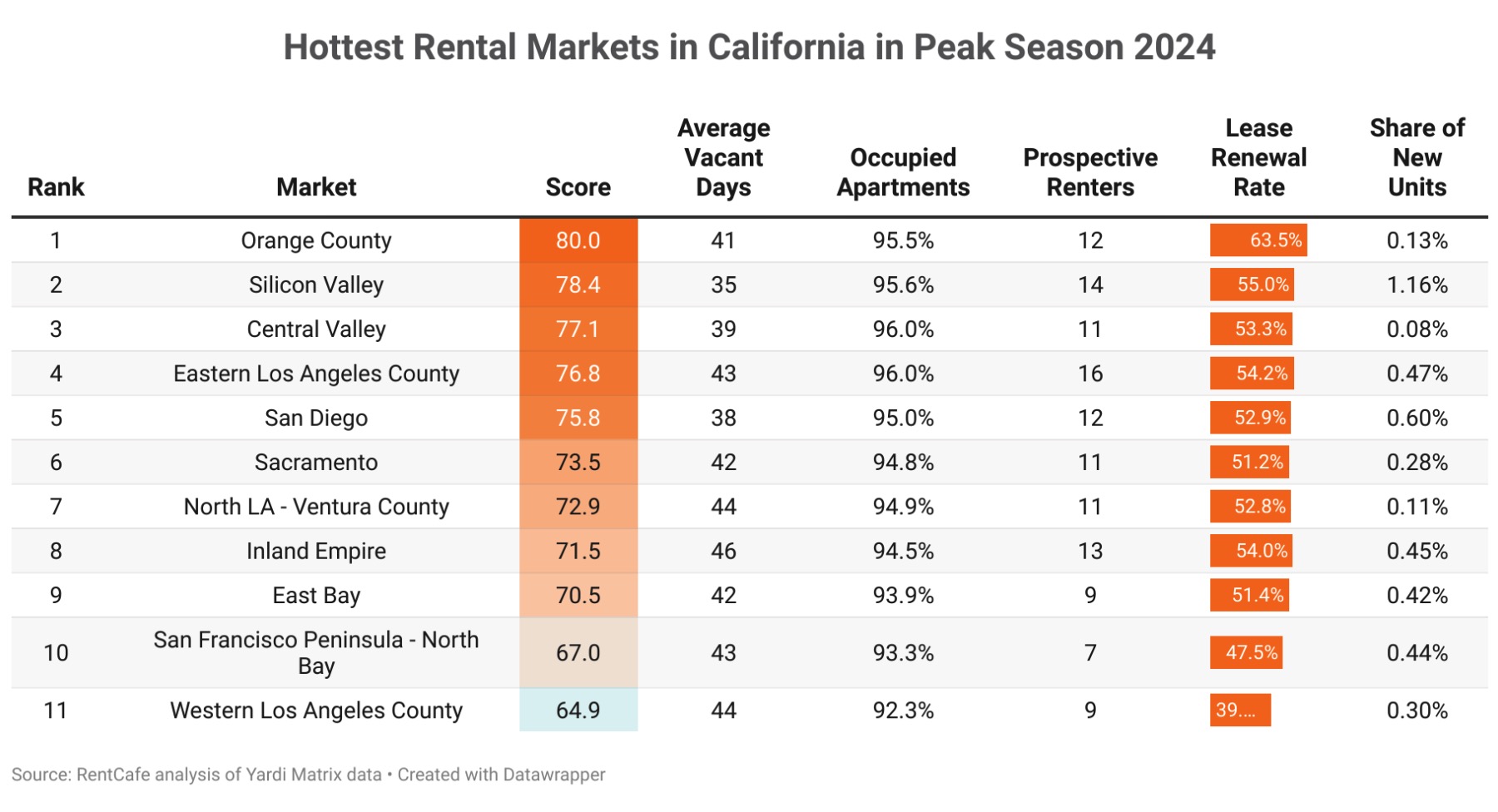 - Orange County is now California’s most challenging rental market. The competitiveness score surged to 80.0 (up from 70.5 last year), with a 95.5% occupancy rate and 12 renters competing per apartment. Limited new apartments entering the market—just 0.13% (down from last year’s 0.66%*)—combined with the highest lease renewal rate in the region at 63.5% (up from 61.0%), means even fewer options for prospective tenants.