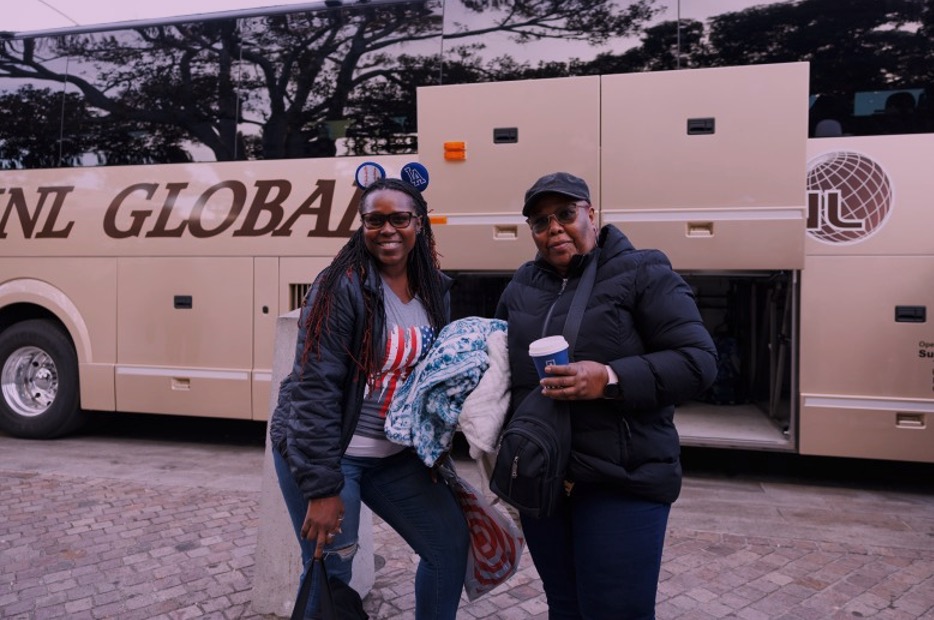 Lauretta Darling and her mom Charlotte Barney, at Placita Olvera in Los Angeles, before boarding a bus headed to Nevada to canvass for Vice President Kamala Harris and Minnesota Gov. Tim Walz, on Oct. 26, 2024. Photo by Elisa Ferrari for CalMatters