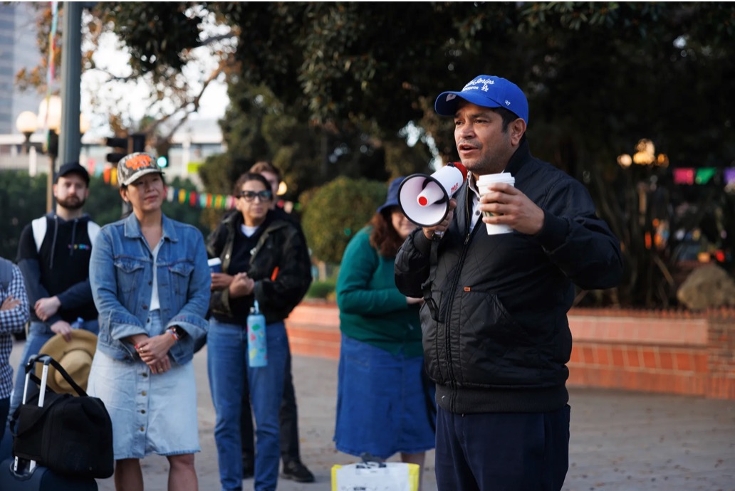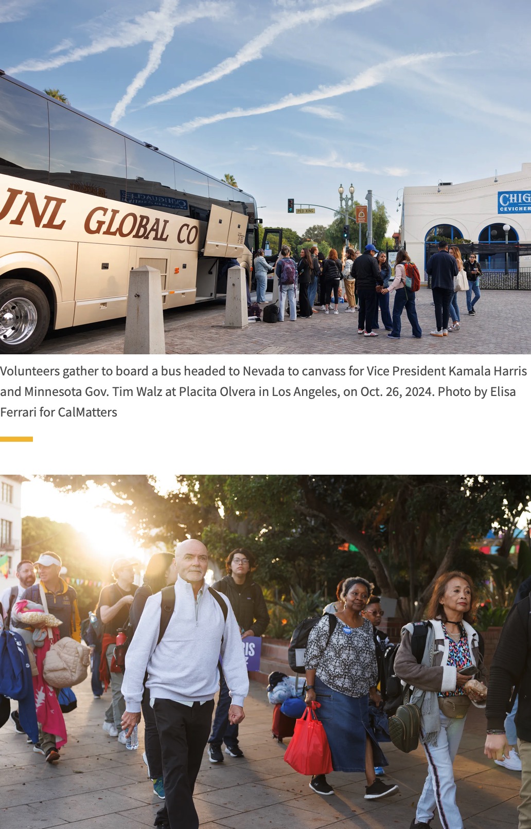 First: Volunteers gather to board a bus headed to Nevada to canvass for Vice President Kamala Harris and Minnesota Gov. Tim Walz. Last: U.S. Rep. Jimmy Gomez, founder of Congressional Dads Caucus, leads a rally before volunteers headed to Nevada. Placita Olvera in Los Angeles on on Oct. 26, 2024. Photos by Elisa Ferrari for CalMatters