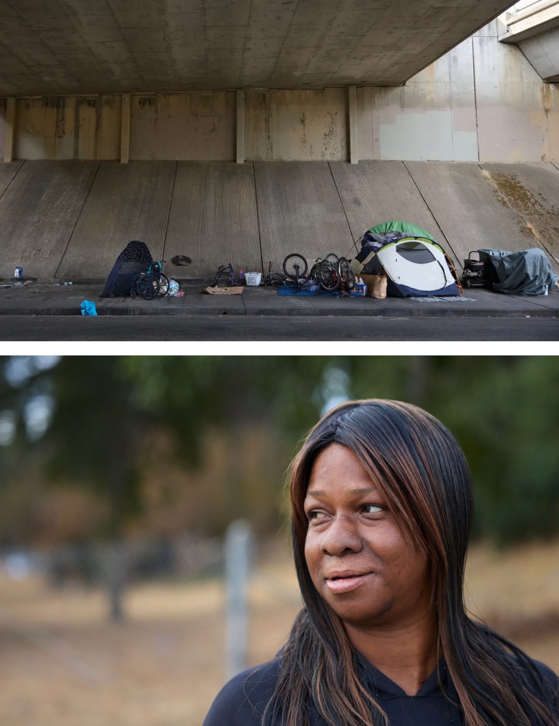 First: A homeless encampment along the sidewalk on X Street under State Route 99. Last: Tyneeka Bland speaks about her experience and challenges with voting during the time she was homeless. Sacramento on Oct. 25, 2024. Photos by Fred Greaves for CalMatters