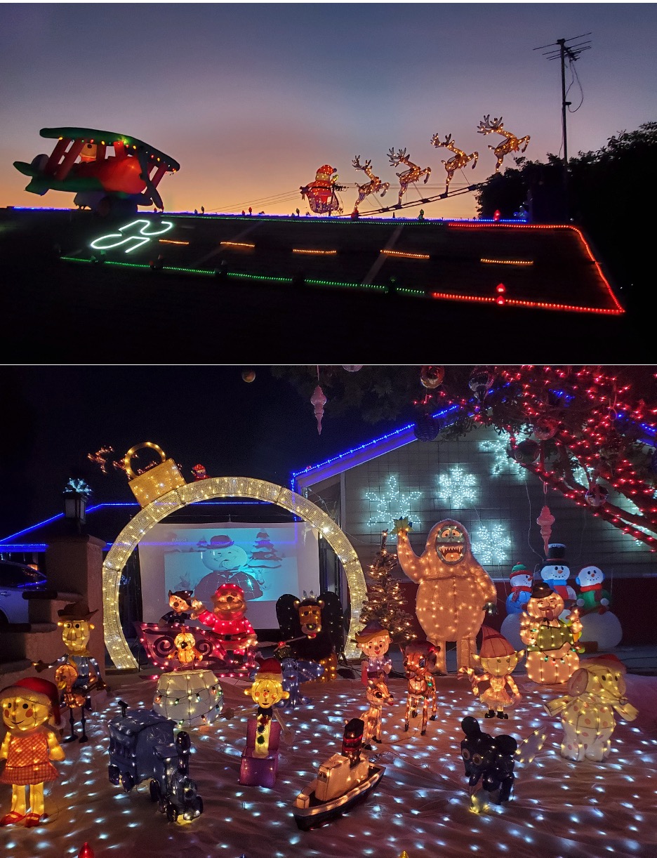 He decorates the exterior of his home and yard in San Diego with iconic holiday personalities to delight the child in all of us. Not only does it include Santa on a sled loaded with gifts, but also a breathtaking display of the unique images which symbolize the generosity of spirit at Christmas that transcends tangible gifts.