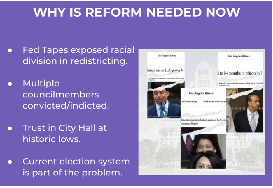 That’s why LA’s current Charter Reform Commission (CRC) process — which began earlier this year — is critical. In November 2024 LA voters approved an Independent Redistricting Commission (IRC) for LA elections, co-authored by Council member Nithya Raman, as an initial response to the Fed Tapes scandal - an important first step.