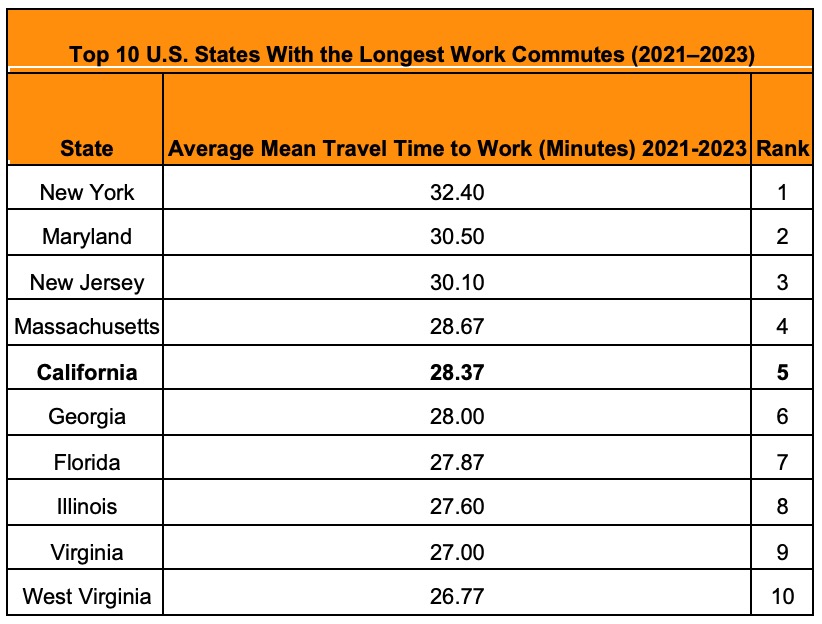 California ranks fifth with an average mean travel time of 28.37 minutes between 2021 and 2023. The Golden State saw a mean work commute of 27.6 minutes in 2021, 28.3 minutes in 2022, and 29.2 minutes in 2023.