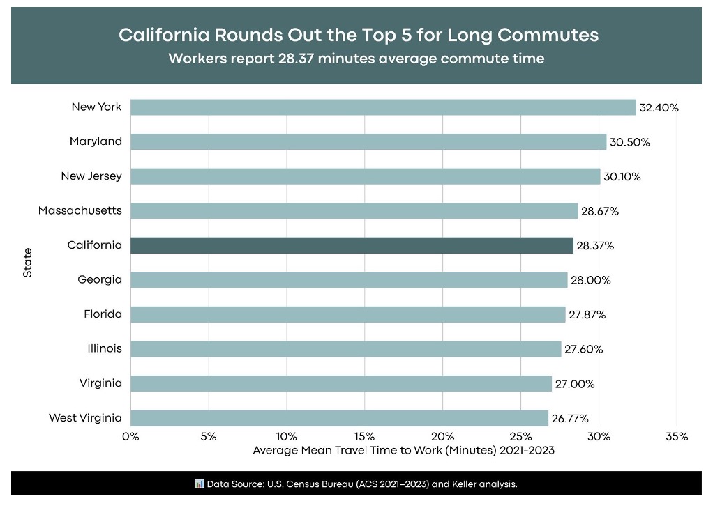 The research by global executive search firm Keller analyzed U.S. states based on the average mean travel time to work between 2021 and 2023. The results were calculated using U.S. Census data to rank where workers commute the most.