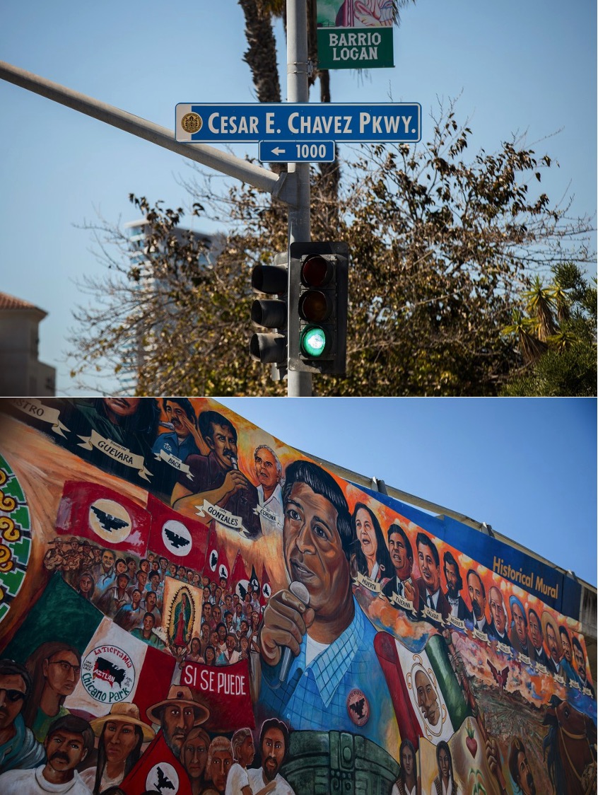 Last: A mural depicts various historical Latino figures, including César Chávez, near Chicano Park in San Diego’s Barrio Logan neighborhood on March 18, 2026. Photos by Adriana Heldiz, CalMatters