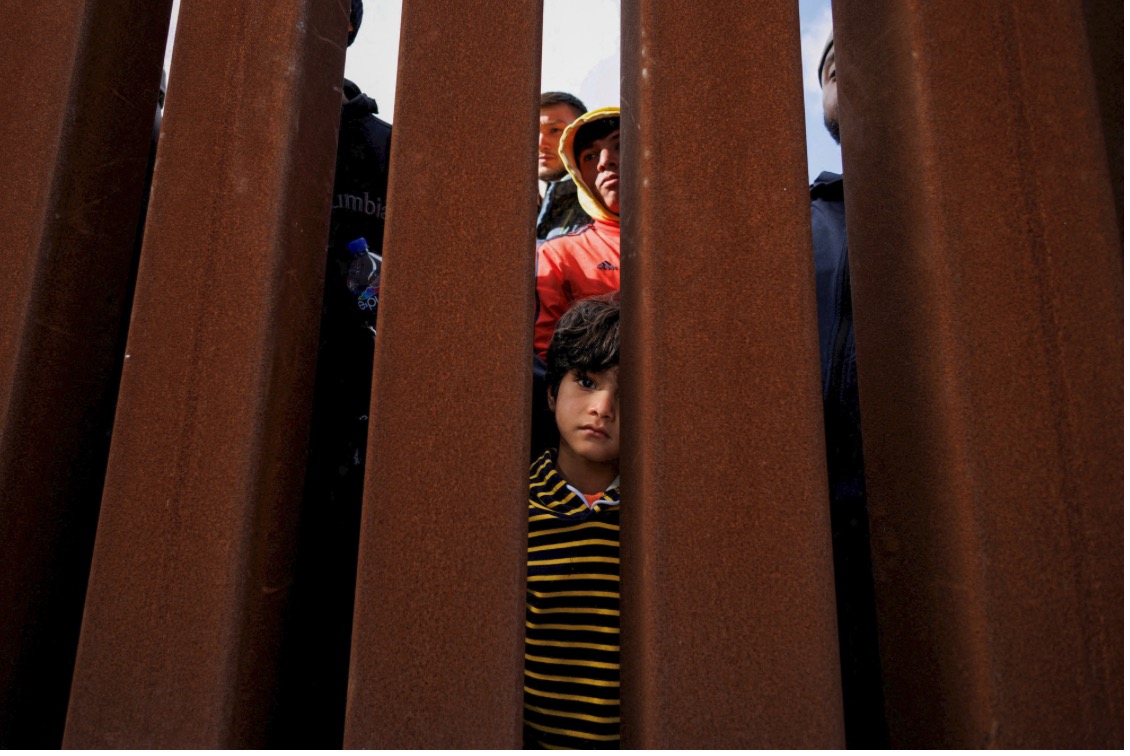 A young boy peers through the border wall as migrants gather between primary and secondary border fences in San Diego as the United States prepares to lift COVID-19-era restrictions known as Title 42, that have blocked migrants at the U.S.- Mexico border from seeking asylum since 2020, near San Diego on May 8, 2023. Photo by Mike Blake, Reuters