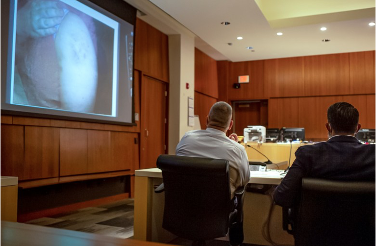 “She was crying and stated that he was going to try and kill her,” Officer Escalera said. They did the interview in the lobby of the station because of COVID and Calley seemed distracted – watching the passing cars and saying she expected to see him. A female sergeant took photos of the bruises over Calley’s body.