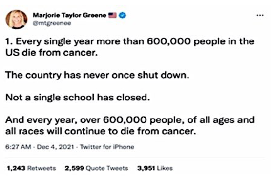 That Marjorie Taylor Greene needs to leave the House and be enrolled in remedial education is self-evident. No-one has ever contracted cancer seated in a classroom.