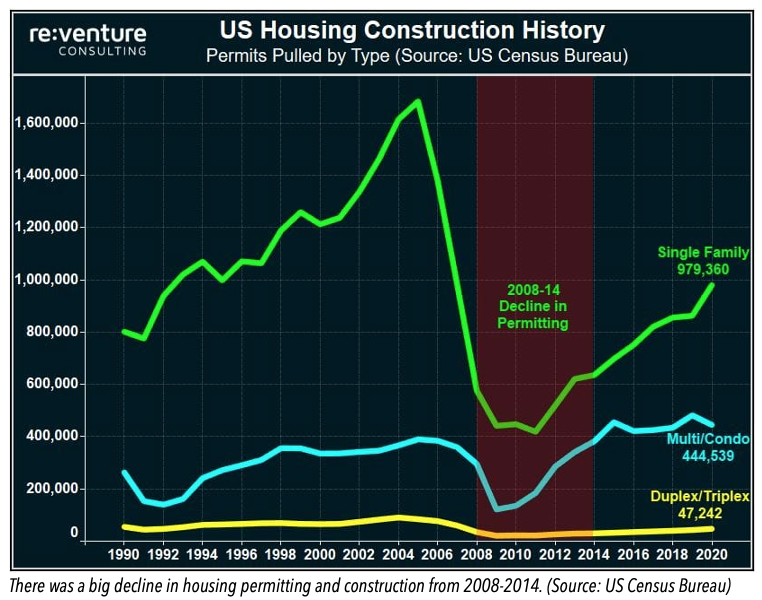 It’s been a slog to get permitting, especially for single-family homes, back to previous levels. Many claim that the 1 million SF permits pulled in 2020 is still well below what the country needs to address the shortage created after the housing crash.