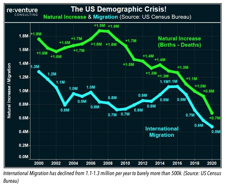 The Net Result: the US Housing Glut? Declining births, increased deaths, and less International Migration have combined to crater US Population Growth (blue line below) over the last five years. Once a figure that registered around +2.5 million annually, it collapsed to barely over +1 million in 2020.