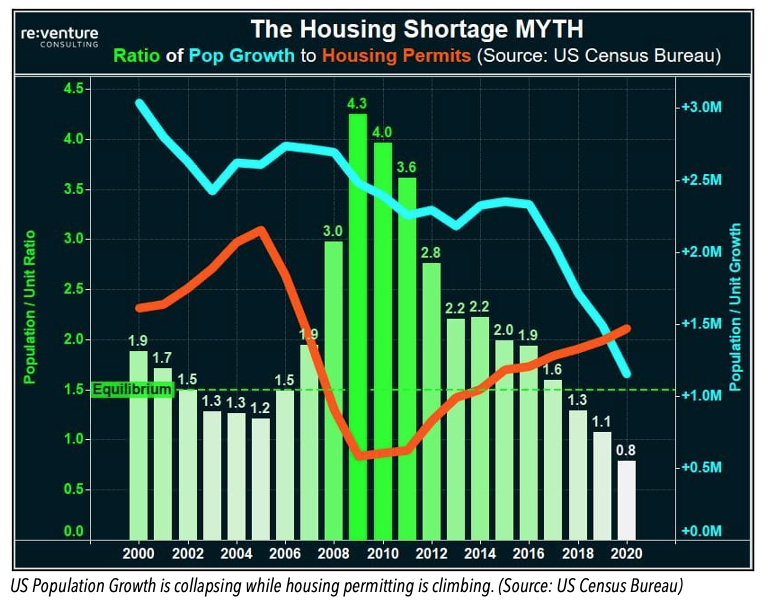 At the same time, permitting and construction of new homes and apartments (orange line below) is picking back up. So much so that permitting of new housing units exceeded US population growth in 2020! This is the first time in recent history that this has happened.