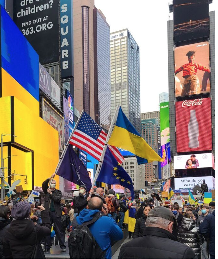 Demonstrators waving U.S, NATO, Ukraine, and E.U. flags at Global Day of action, March 5, 2022,New York City. Photo by AS Amaral.