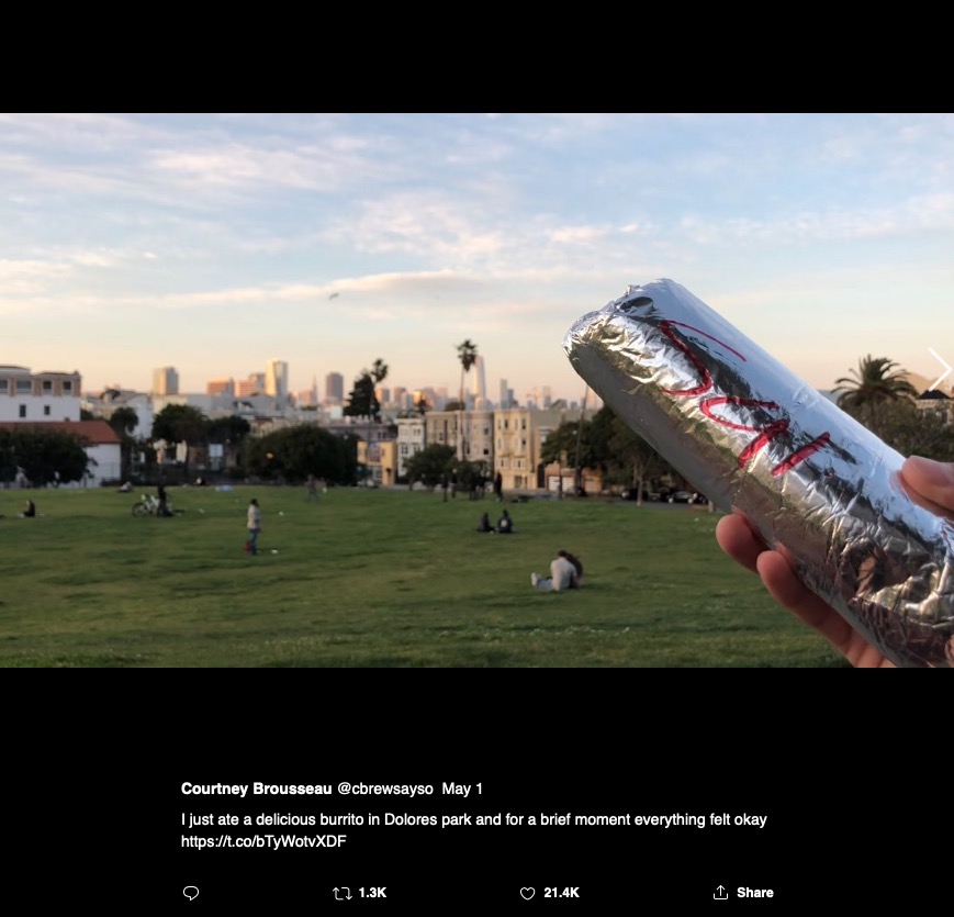 On May 1, 2020, Courtney tweeted from a San Francisco park bench, “I just a delicious burrito at Delores Park [sic] and for a brief moment, everything felt okay.”