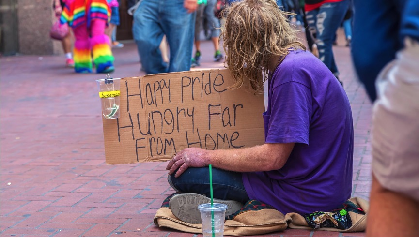 Homeless man sitting on the sidewalk at the Pride parade begging for food, San Francisco, California, USA, 30 June 2019 / Alamy