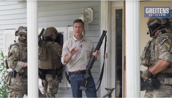 Or how about: "I'm Eric Greitens, Navy SEAL, and today, we're going RINO-hunting." This is not about killing rhinoceroses. "RINO" stands for Republican in Name Only—you know, anti-Trumpers. Greitens, former governor of Missouri, who resigned in the wake of a sexual abuse allegation, is now running for the Senate—running fully armed and dangerous as hell, at least according to his little TV ad, which features him and a bunch of guys dressed up in camouflage outfits, fully armed, kicking someone's door open, tossing in a smoke bomb.