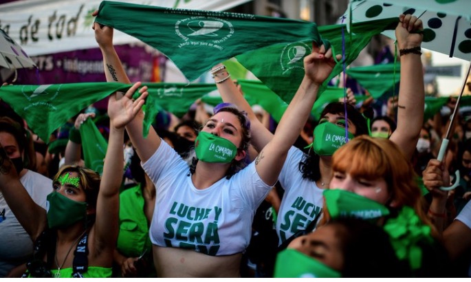 In Latin America, new and transformative abortion laws were secured by "the green tide": an international feminist movement for bodily autonomy and abortion access that crossed state borders, identified by the green scarves activists wear at demonstrations. The imagery has historic roots in feminist and economic justice movements, including movements against domestic violence, international feminist strikes, and popular resistance to military rule led by the Mothers of the Plaza de Mayo. During COVID-19, millions of women wearing green scarves joined protests demanding abortion care across Latin Americaunder the banner: "Ni Una Menos. Vivas y libres nos queremos" ("Not One Woman Less. We want to be alive and free"). This feminist framing of abortion as a human rights issue drove home the message that abortion is not a discrete issue, but part of the spectrum of rights that guarantees the safety and wellbeing of people across the region.
