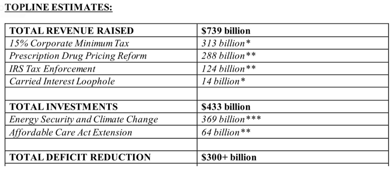 coal baron Joe Manchin and Senate Majority Leader Chuck Schumer put out a joint statement on Wednesday announcing they had come to terms on a deal to spend hundreds of billions on climate and energy programs, reduce prescription drug prices, and raise taxes on the wealthiest while shrinking the federal deficit.
