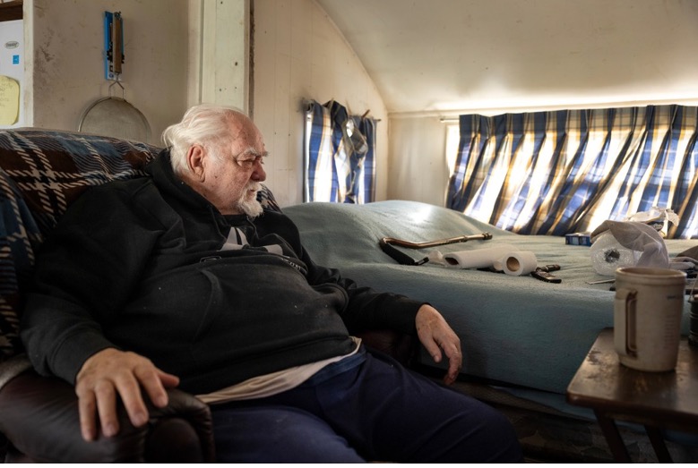 Bobby Riley, 87, at his home at Stockton Park Village in the outskirts of Stockton on Jan. 27, 2023. Riley said he has been relying on a generator for electricity and bottled water for bathing since earlier that month. Photo by Miguel Gutierrez Jr., CalMatters