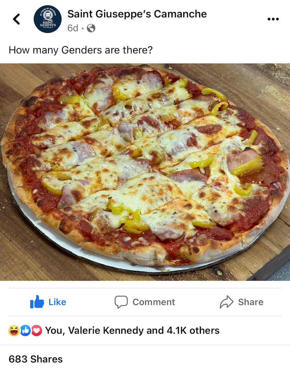 I learned that edgy marketing can be super beneficial to your business. A while back, we were having a slower night at Camanche. We are a small town, and we're not on the best side of town as far as traffic goes. I was having a good day at the gym, and I was feeling a little squirrely. We all have our beliefs, and obviously, I believe there's only two genders. So I thought, I'm going to put up post, and it's going to be [an image of] our pizza, and then how many genders are there? And the people that comment on it, I'm going to message them [privately with] a free small pizza. So we start getting comments: two, two, two, etc. I would consider Comanche to be a based community, lots of really good people there who understand God's creation and how there are only two genders. Well, it turns out that there's a couple of people in Comanche who disagreed with “two”. And they say, “why are you privately responding to all the people saying two, and they ended up finding out why.” The transgender gender fluidity movement have a pretty wide internet network. They can spread [content] pretty rapidly. They shared it, they commented and what they forget, is that they're exposing my pizza, my business. We are about to reach a million people this week, without having spent any money. This would have cost me $100,000. At first, we started losing Facebook likes, people saying, you shouldn't engage in politics. This isn't politics, guys. It's a simple post, and if they don't understand that, that's okay. When I lose Facebook likes, that doesn't mean I lose business, I just lose Facebook likes. I [did get] a little nervous because we went from 2420, down to 2397. And then five hours into the post, I noticed an uptick and we went up by, 40. Then all of a sudden, it goes up 100. I'm looking at my brother Sam, “Dude, we're up 300 likes today, like what is going on here?” I was worried that it was the people who don't like me, but then I started to see a type of engagement like, “Hey, man, keep up the good work, your post reached Wisconsin. Keep doing what you're doing, keep fighting the good fight.” And then there'll be another comment. “Hey, I'm up in Canada.” And we're reaching people from the UK, from Ireland from Australia. There's one guy from Portugal, all over the world, you know?”