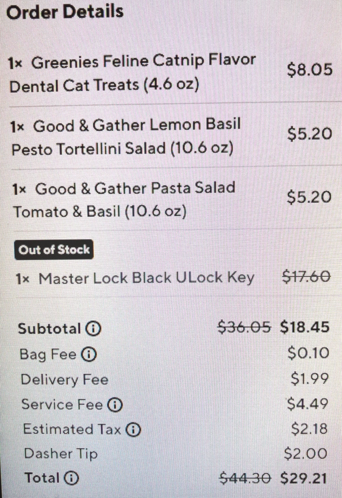 If you order over 35 dollars of groceries you get Free Delivery (if you have a DashPass paid membership)...you still have to pay a Service Fee. So, on March 18, something sleazy happened. I did a 36 dollar (pre-tax and pre-fees) order from Target (which is in the mall next door to me) of 2 ready-to-eat-salads, cat treats, and a bike lock. The real reason for the order was to get the bike lock, and the store only had one model that I wanted. The original grand total charge (including tip, tax, and service fee) was 44.30. The bike lock (17.60 pre-tax) was out of stock; the store did not have it even though it was on the DD online menu. The Final Total Charge for my order was 29.21. That's an approximate credit of only 15 dollars. But, with LA and CA sales tax, it should be around 19 dollars credit back. It appears that DD added in a delivery fee of 1.99 and increased the Service Fee to a HUGE (percentage-wise) 4.49 (while leaving my original tip NOT reduced) AFTER-the-fact because the store was missing one of my items...super shady.