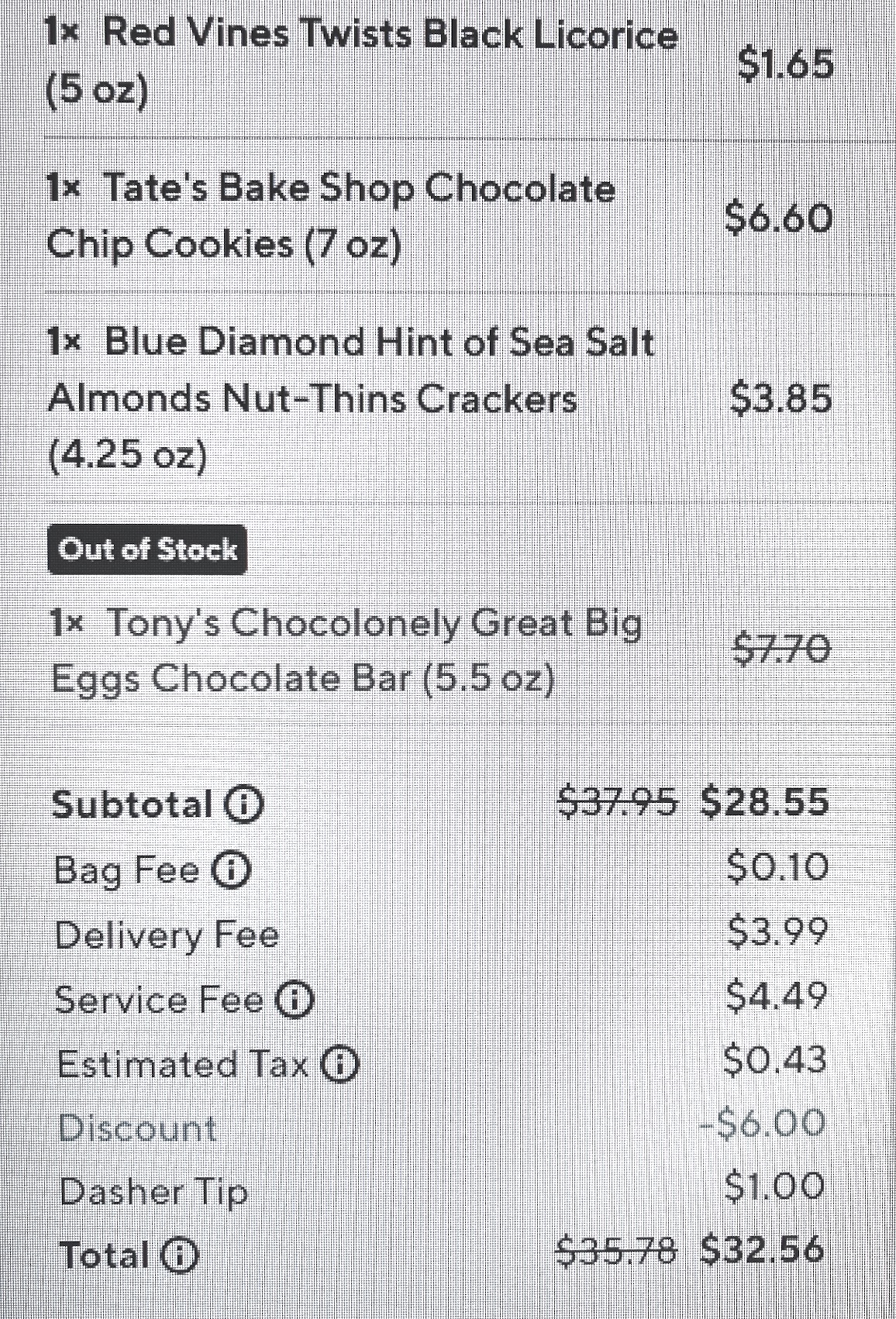 Then, on March 21, it happened again, this time on a Smart & Final order. I ordered 5 bananas, 1 bag of Pecan Halves, 1 bunch of Organic Bananas, 2 Red Vines boxes (quite unhealthy), 1 big bag of SkinnyPop Popcorn, 1 Tate's Chocolate Chip Cookies, and 1 Blue Diamond Hint of Sea Salt Almonds Nut-Thins Crackers, because DD was having a promotion that you get 6 dollars off. The original grand total with Service Fee and Tip (I add more cash tip when I get the order) was 35.78 (because of the 6 dollar discount promotion). One item, that I have not mentioned yet, was missing: Tony's Chocolonely (and I just realized the word Lonely is in that Brand name) Chocolate Eggs for 7.70 plus service fee. Out of stock and not my fault. So, I figure I should get at least 8 dollars back for that item. Nope. DoorDash added a Delivery Fee of 3.99 and my final grand total was 32.56. I only got roughly 3 dollars back.